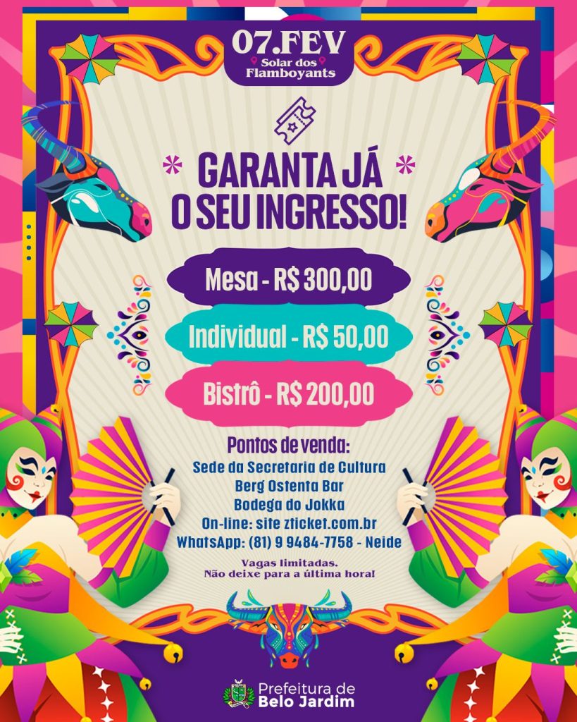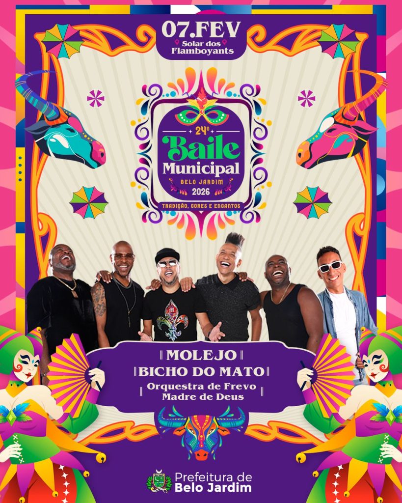 Vem aí o 24º Baile Municipal de Belo Jardim, com data, horário e local já confirmados. A festa começa às 20h, no Solar dos Flamboyants, e promete muita cor e alegria. A edição deste ano contará com a Orquestra de Frevo Madre de Deus, a Banda Bicho do Mato e o consagrado Grupo Molejo, garantindo um repertório diversificado que vai do frevo ao samba, agradando públicos de todas as idades.