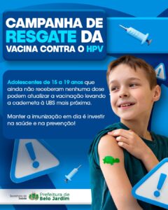 Adolescentes de Belo Jardim, com idades entre 15 e 19 anos, que ainda não tomaram nenhuma dose da vacina contra o HPV já podem procurar a Unidade Básica de Saúde (UBS) mais próxima para se vacinar. A Prefeitura, por meio da Secretaria de Saúde, reforça que está realizando uma campanha para ampliar a cobertura vacinal e garantir mais proteção à população jovem.