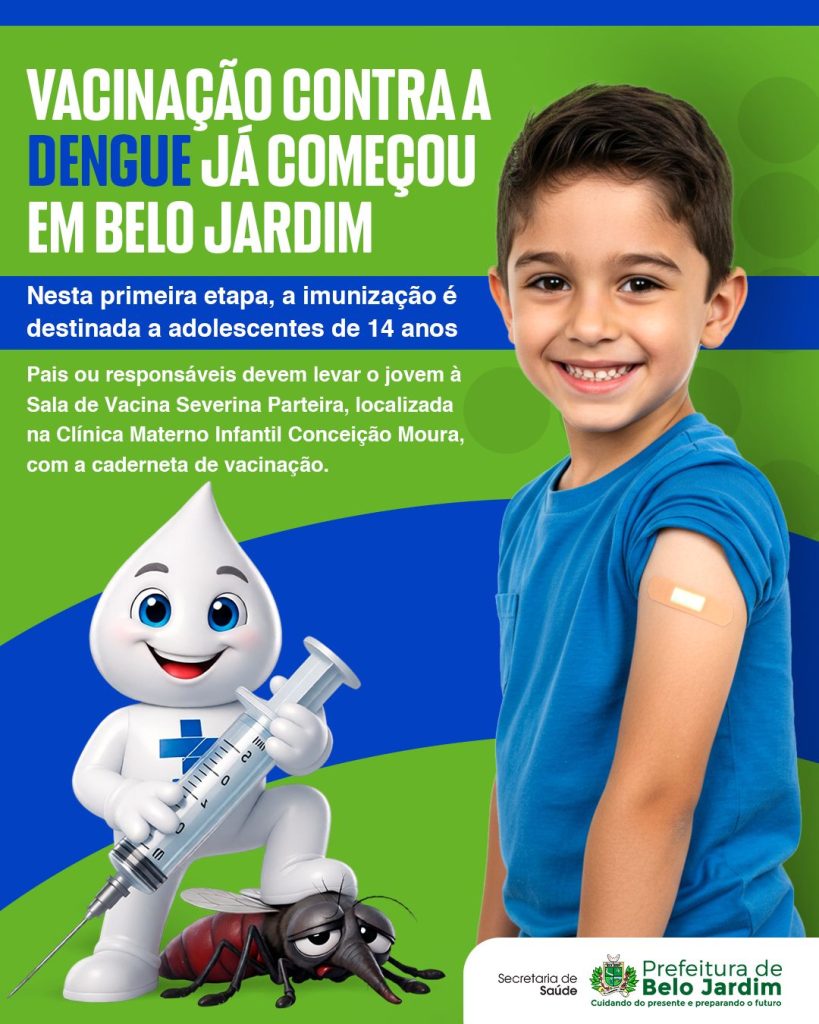 Teve início em Belo Jardim a aplicação da nova vacina contra a dengue, promovida pela Prefeitura, por meio da Secretaria Municipal de Saúde. Nesta primeira etapa, a imunização ocorre exclusivamente na Sala de Vacina Severina Parteira, localizada na Clínica Materno Infantil Conceição Moura, na Rua Cel. Antônio Marinho, nº 335, bairro Ayrton Maciel, e, devido à quantidade limitada de doses recebidas inicialmente (135 doses), está sendo destinada apenas a adolescentes de 14 anos, conforme orientação do Ministério da Saúde.