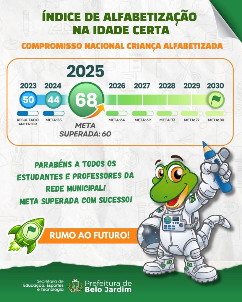 A Prefeitura de Belo Jardim, por meio da Secretaria de Educação , Esportes e Tecnologia, comemora um importante avanço na educação do município. De acordo com o Indicador de Compromisso com a Alfabetização (ICA), divulgado pelo Ministério da Educação, a cidade superou a meta nacional e também o índice do Estado. Em pouco tempo, o número de crianças alfabetizadas na idade certa passou de 44% para 68%, mostrando que o trabalho realizado nas escolas da rede municipal tem gerado bons resultados.