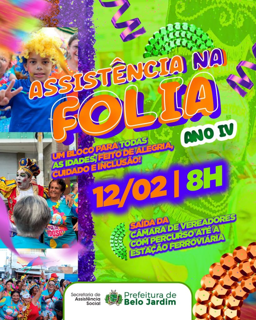 A Prefeitura de Belo Jardim, por meio da Secretaria de Assistência Social, realiza no dia 12 de fevereiro, a 4ª edição do bloco “Assistência na Folia”, uma iniciativa de inclusão, entretenimento e lazer, que tem o objetivo de promover um momento de alegria, inclusão e socialização para os usuários assistidos pela secretaria, reforçando o compromisso da gestão com o cuidado social e a valorização da cultura popular.