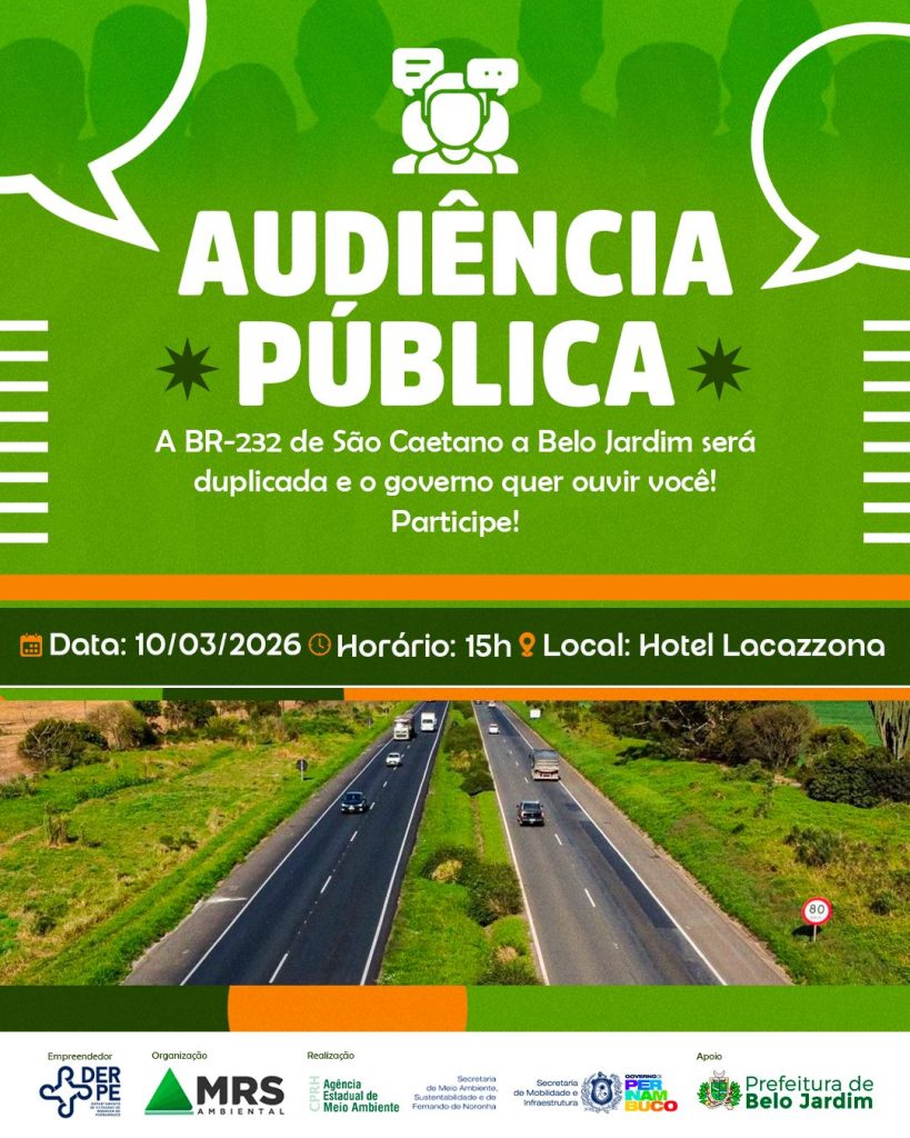 A próxima terça-feira (10) será marcada por um importante momento de diálogo e construção coletiva para o Agreste pernambucano. Será realizada uma Audiência Pública referente à duplicação, adequação e restauração da BR-232, no trecho que compreende os municípios de São Caetano a Belo Jardim, no Hotel Lacazzona, às 15h. A iniciativa tem como objetivo apresentar o projeto à população, esclarecer dúvidas, ouvir contribuições da sociedade e tratar sobre o Estudo de Impacto Ambiental (EIA/RIMA), etapa fundamental para o avanço do empreendimento.