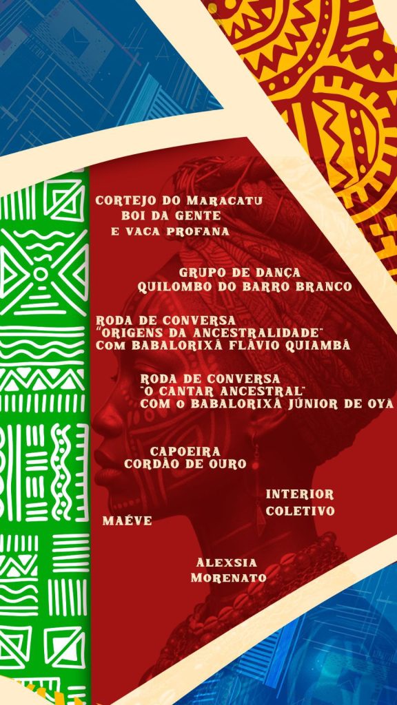Entre os destaques estão o cortejo de Maracatu Boi da Gente e Vaca Profana, grupo de dança Quilombo do Barro Branco, roda de conversa “Origens da Ancestralidade”, com o babalorixá Flávio Quiaba, roda de conversa “O Canto Ancestral”, com o babalorixá Júnior de Oyá, Capoeira Cordão de Ouro, Interior Coletivo, além de apresentações musicais com Alexsia Morenato e Maéve.