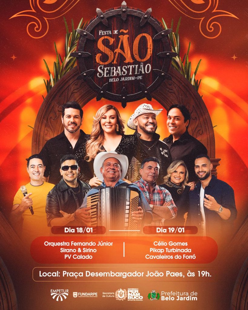 A Prefeitura de Belo Jardim realiza, nos dias 18 e 19 de janeiro, a tradicional Festa de São Sebastião, co-padroeiro do município. O evento acontece a partir das 19h, na Praça da Cultura Desembargador João Paes, e promete reunir famílias belo-jardinenses em mais um momento de cultura e entretenimento. A festa é uma realização da Secretaria de Cultura, Turismo e Empreendedorismo, com o apoio da Empetur, Fundarpe e do Governo de Pernambuco.