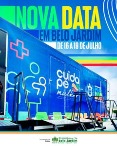 Por decisão do Governo do Estado, a Carreta da Mulher Pernambucana estará em Belo Jardim em novas datas: de 16 a 19 de julho. Inicialmente prevista para começar no dia 14, a ação precisou ter seu cronograma ajustado por questões de logística estadual. A iniciativa, realizada em parceria com a Prefeitura Municipal, levará serviços gratuitos de saúde para mulheres e ficará estacionada na Praça da Cultura Desembargador João Paes, no centro da cidade, das 8h às 15h.