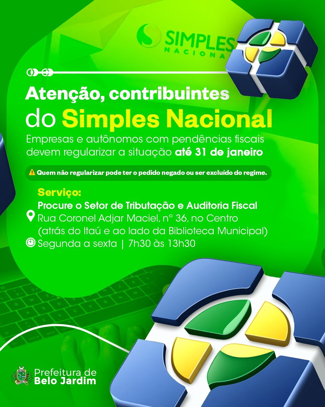 A Prefeitura de Belo Jardim, por meio do Setor de Tributos, faz um chamado às empresas, autônomos e contribuintes enquadrados no Simples Nacional que possuem pendências fiscais para que regularizem a situação até o dia 31 de janeiro. O prazo é decisivo para garantir a permanência ou a efetivação no regime e evitar transtornos junto