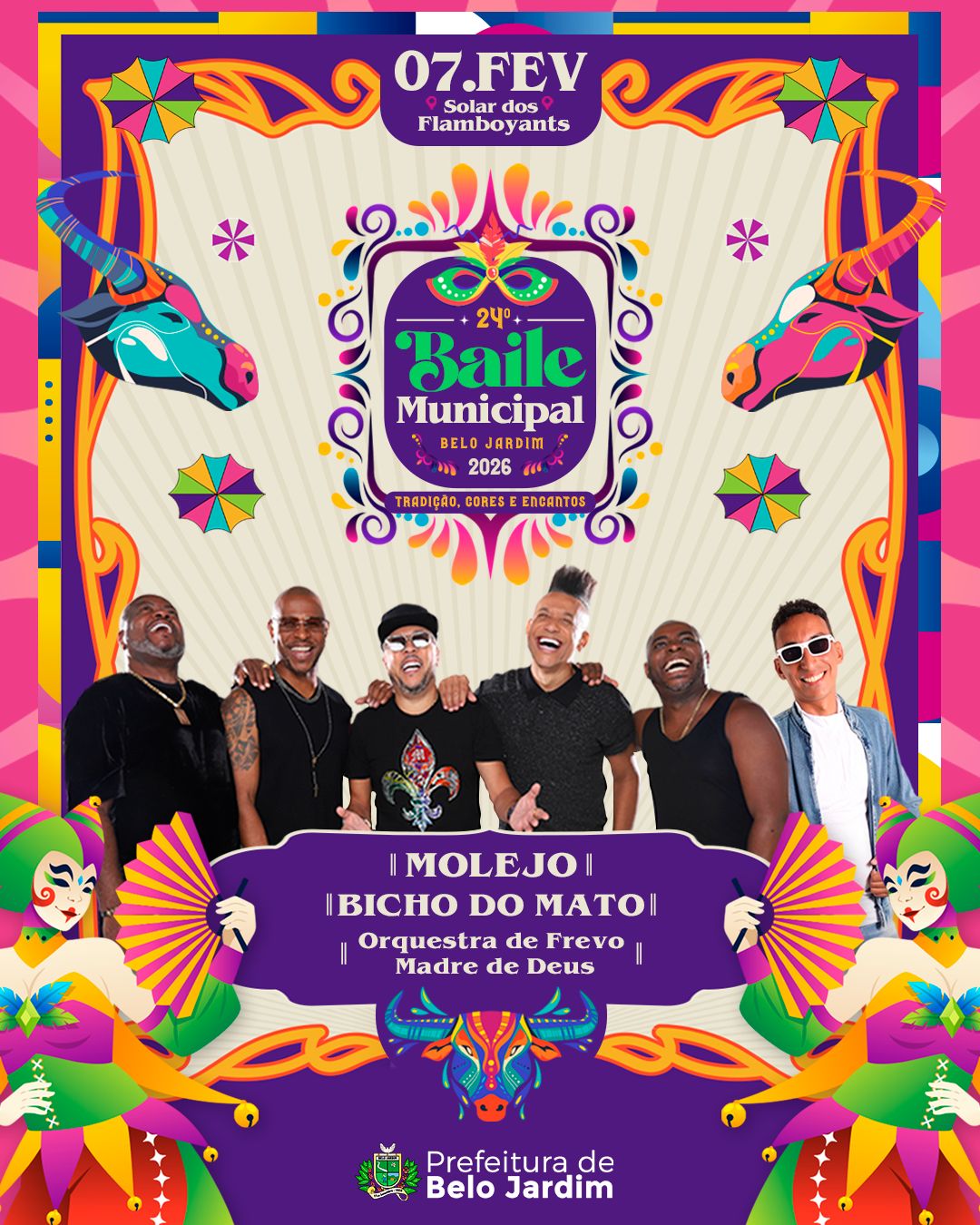 Vem aí o 24º Baile Municipal de Belo Jardim, com data, horário e local já confirmados. A festa começa às 20h, no Solar dos Flamboyants, e promete muita cor e alegria. A edição deste ano contará com a Orquestra de Frevo Madre de Deus, a Banda Bicho do Mato e o consagrado Grupo Molejo, garantindo
