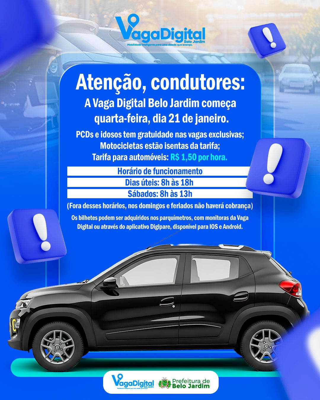 A Prefeitura de Belo Jardim inicia, na próxima quarta-feira (21), o funcionamento da Vaga Digital Belo Jardim (Zona Azul), sistema de estacionamento rotativo que visa organizar o uso das vagas, garantir mais segurança e melhorar a rotatividade no trânsito nas áreas do centro da cidade. O serviço terá gratuidade para idosos e pessoas com deficiência
