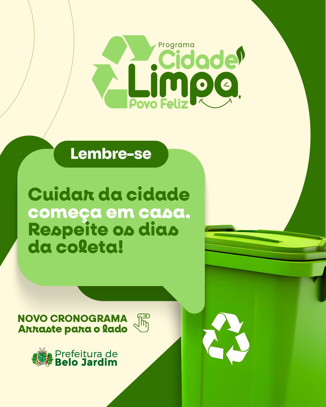 A Prefeitura de Belo Jardim vai iniciar um novo cronograma da coleta de lixo a partir da próxima segunda-feira (20). A prefeitura passa a ser responsável por todos os serviços de limpeza urbana do município, incluindo a coleta de lixo domiciliar. Para garantir um serviço ágil e eficiente, novos caminhões de coleta foram contratados e