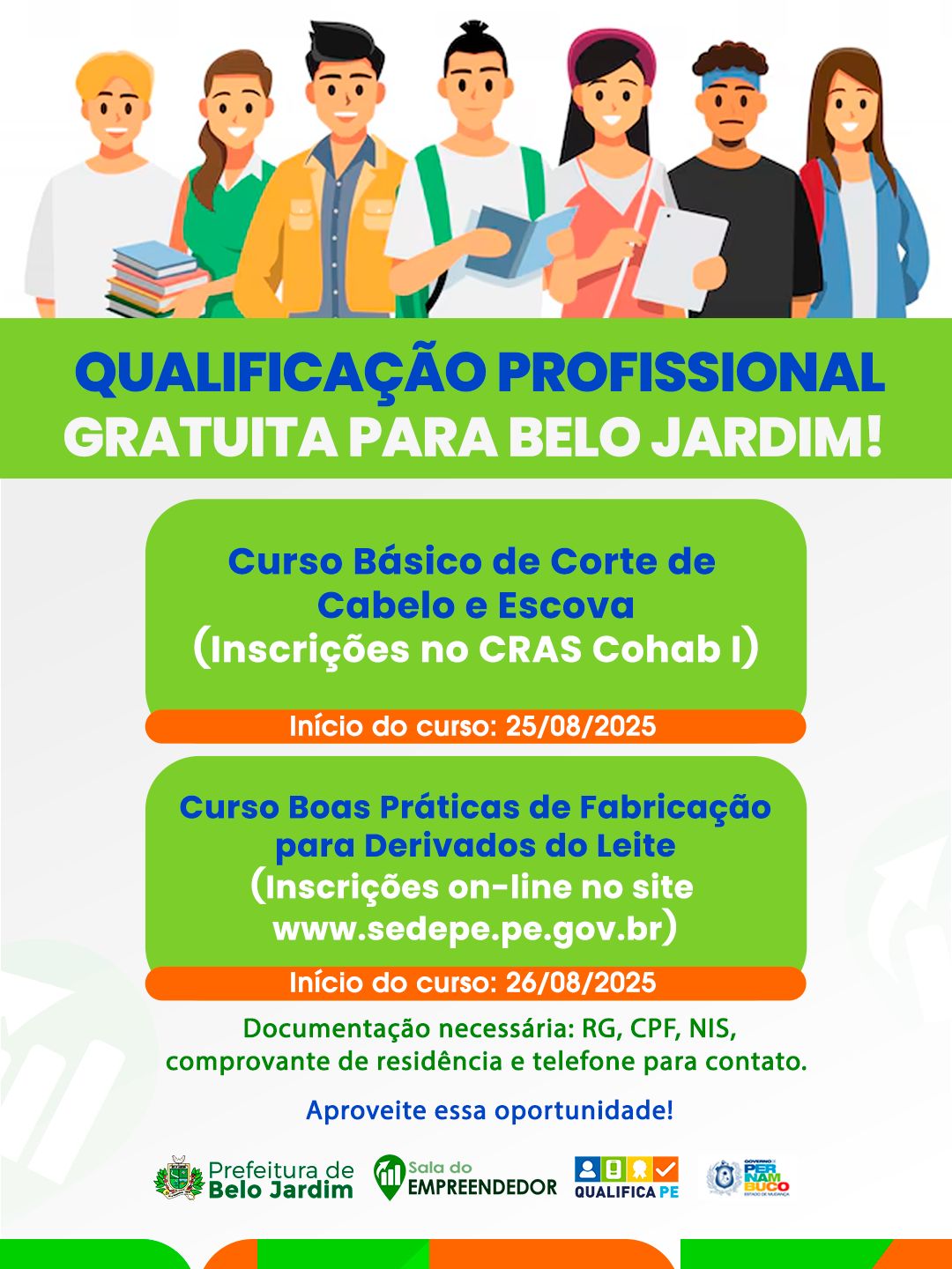 A Prefeitura de Belo Jardim, em parceria com o Programa Qualifica PE, do Governo do Estado de Pernambuco, está oferecendo dois cursos gratuitos de capacitação. O primeiro é o “Básico de Corte de Cabelo e Escova” e o segundo, “Boas Práticas de Fabricação para Derivados do Leite”. Ambas as oportunidades são voltadas para pessoas inscritas