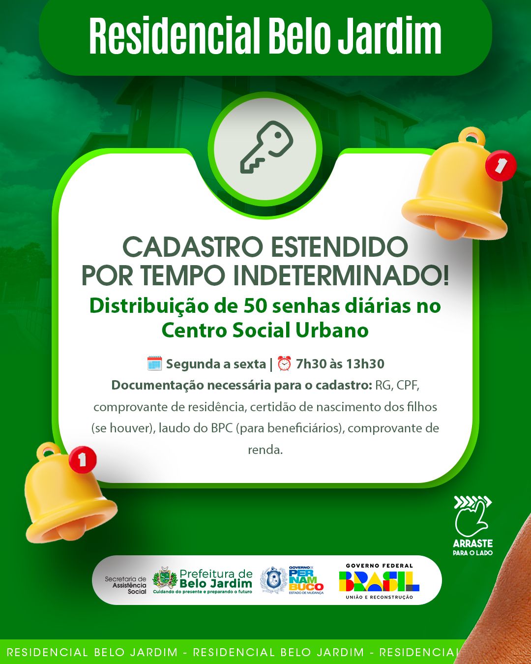 A Prefeitura de Belo Jardim informa que, diante da alta procura, o prazo para realização do cadastro das famílias interessadas em participar da seleção das unidades habitacionais do Residencial Belo Jardim passa a ser por tempo indeterminado. O novo habitacional do município beneficiará 144 famílias em situação de vulnerabilidade social e será construído através de