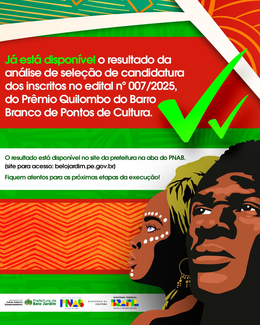 A Prefeitura de Belo Jardim informa que o resultado preliminar do Prêmio Quilombo do Barro Branco de Pontos de Cultura já está disponível e pode ser consultado no site da prefeitura (www.belojardim.pe.gov.br), na aba da PNAB. A iniciativa refere-se ao reconhecimento de pontos de cultura do município, que atendam ao requisitos da Política Nacional de