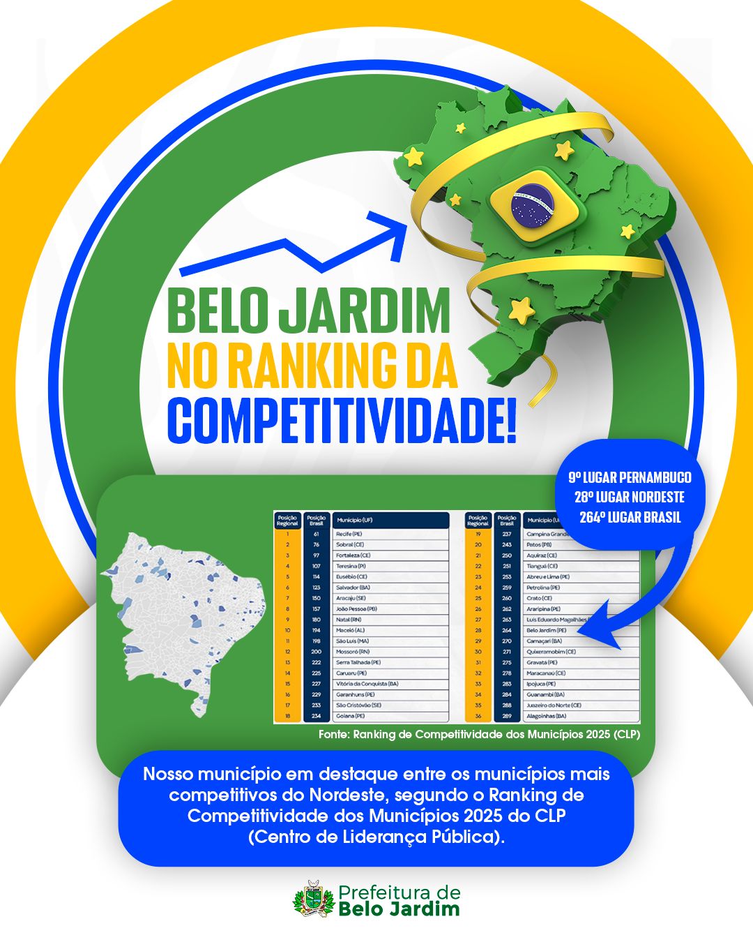 Belo Jardim alcançou uma posição de destaque no Ranking dos Municípios mais Competitivos do País, que avalia a eficiência da gestão pública em todo o Brasil. O município ficou em 9º lugar em Pernambuco, 28º no ranking regional do Nordeste e 264º no ranking nacional. O resultado reforça o compromisso da gestão municipal em garantir