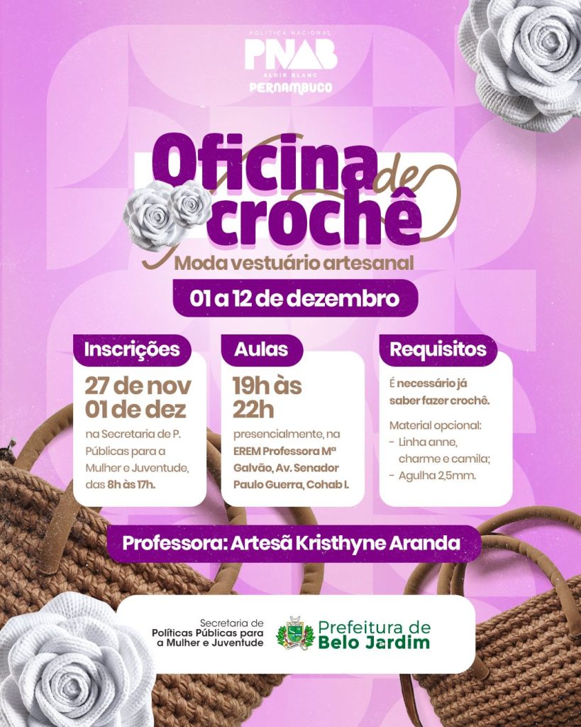 Estão abertas as inscrições para a Oficina de Crochê: Moda Vestuário Artesanal, iniciativa realizada pela Prefeitura de Belo Jardim, através da Secretaria de Políticas Públicas para a Mulher e Juventude (SEMUJUV), vinculada à Política Nacional Aldir Blanc (PNAB) do Governo de Pernambuco. A ação busca fortalecer o empreendedorismo feminino, promover autonomia e valorizar o trabalho manual como fonte de geração de renda no município. As inscrições acontecem entre os dias 27 de novembro e 1º de dezembro, na sede da SEMUJUV, das 8h às 17h, localizada por trás do Banco Itaú.