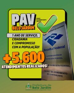 O Ponto de Atendimento Virtual (PAV) implantado em Belo Jardim através de parceria com a Receita Federal, completa seu primeiro ano de funcionamento no município com a marca de mais de 5.600 atendimentos realizados. Implantado pela Prefeitura por meio da Secretaria de Cultura, Turismo e Empreendedorismo, o PAV tem sido essencial para aproximar os serviços da Receita Federal da população, oferecendo mais comodidade e agilidade no atendimento às demandas fiscais e tributárias.