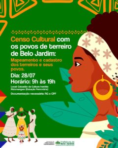 A Prefeitura de Belo Jardim, por meio da Secretaria de Cultura, Turismo e Empreendedorismo, convoca todos os povos de terreiro do município a participarem do Censo Cultural, que será realizado na próxima segunda-feira (28). A ação acontece das 9h às 19h, no Calçadão da Cultura Ivanildo Ridomarques, na Estação Ferroviária, e tem como objetivo mapear e cadastrar os terreiros e seus representantes, reconhecendo a importância histórica, social e cultural das religiões de matriz africana presentes no município.