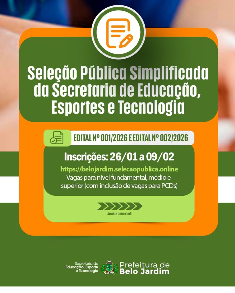 A Prefeitura de Belo Jardim, por meio da Secretaria de Educação, Esportes e Tecnologia, publicou dois editais de Seleção Pública Simplificada para o preenchimento de vagas imediatas e formação de cadastro reserva, contemplando oportunidades para níveis fundamental, médio e superior, tanto para a zona urbana quanto para a zona rural, incluindo vagas destinadas a pessoas com deficiência. As inscrições acontecem de 26 de janeiro a 9 de fevereiro através do site https://belojardim.selecaopublica.online/ onde o edital também está disponível.
