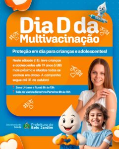 A Prefeitura de Belo Jardim, por meio da Secretaria Municipal de Saúde, realiza neste sábado (18), o Dia D da Campanha Nacional de Multivacinação e Resgate da Vacina contra o HPV, voltado para crianças e adolescentes de até 19 anos. A ação tem o objetivo de garantir que o público-alvo mantenha a caderneta de vacinação atualizada e que as doses em atraso sejam regularizadas. A campanha segue até o dia 31 de outubro em todo o município.