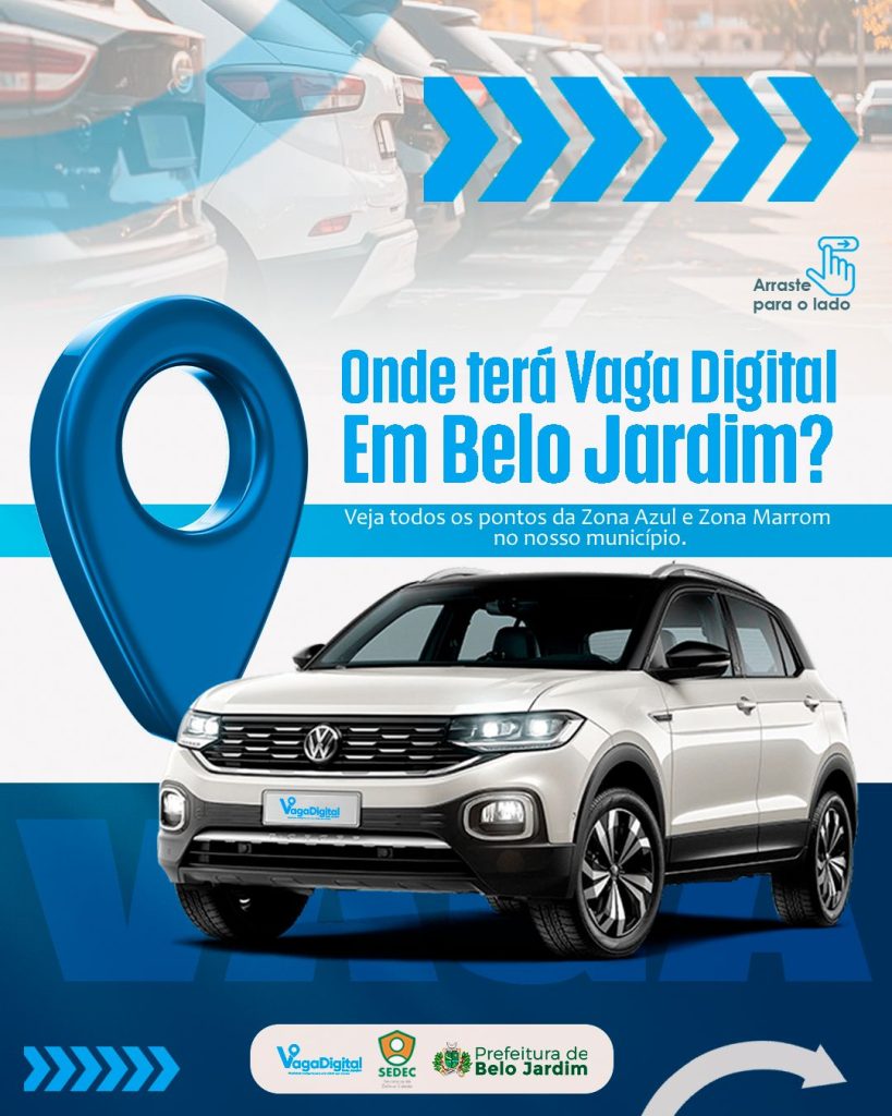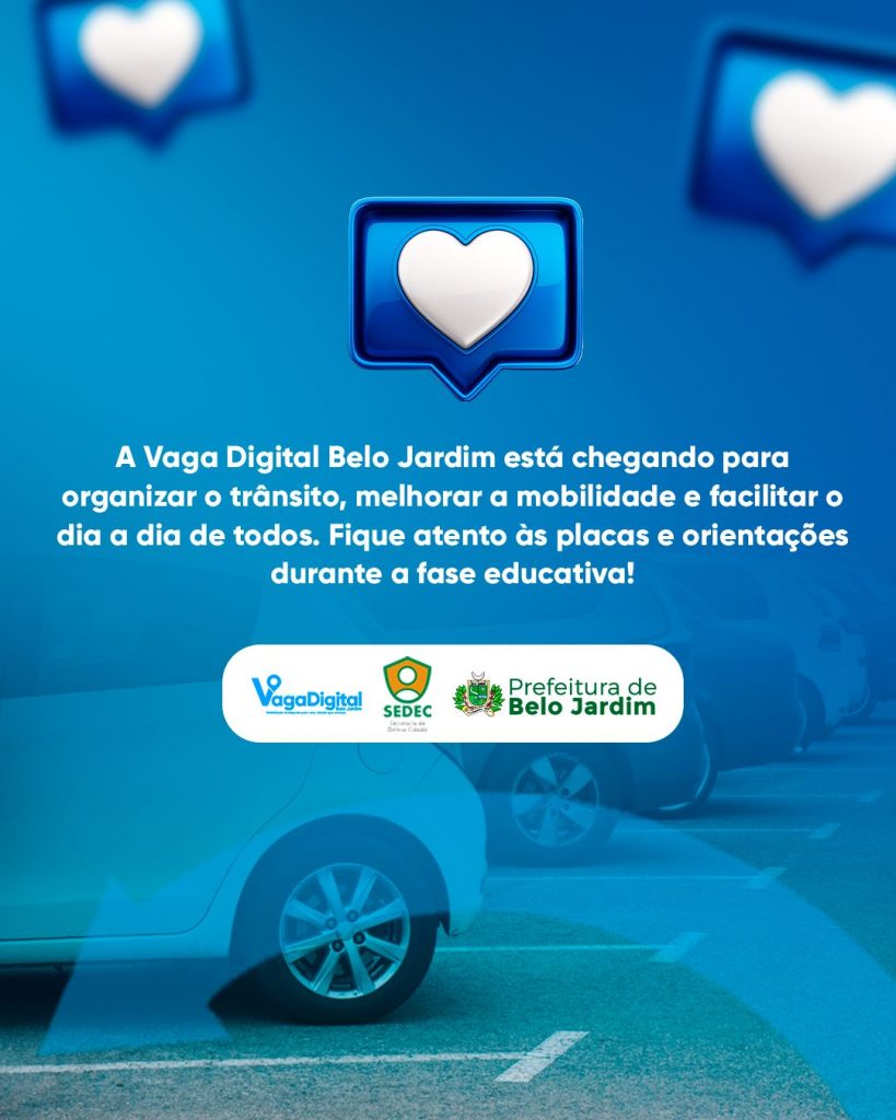 A Prefeitura de Belo Jardim informa que o Sistema de Estacionamento Rotativo Eletrônico Pago, denominado Vaga Digital Belo Jardim, será implantado oficialmente no dia 19 de dezembro, após o período de campanha educativa, que ocorrerá entre os dias 5 e 18. Ao todo, serão 34 pontos no município contemplados com a iniciativa, que tem como objetivo organizar o fluxo de veículos, melhorar a mobilidade urbana e ampliar a rotatividade nas áreas de maior concentração comercial e de serviços. O sistema oferecerá 639 vagas por dia, incluindo espaços para motocicletas, além de vagas exclusivas para idosos, pessoas com deficiência e para carga e descarga, garantindo mais acessibilidade e organização no trânsito.