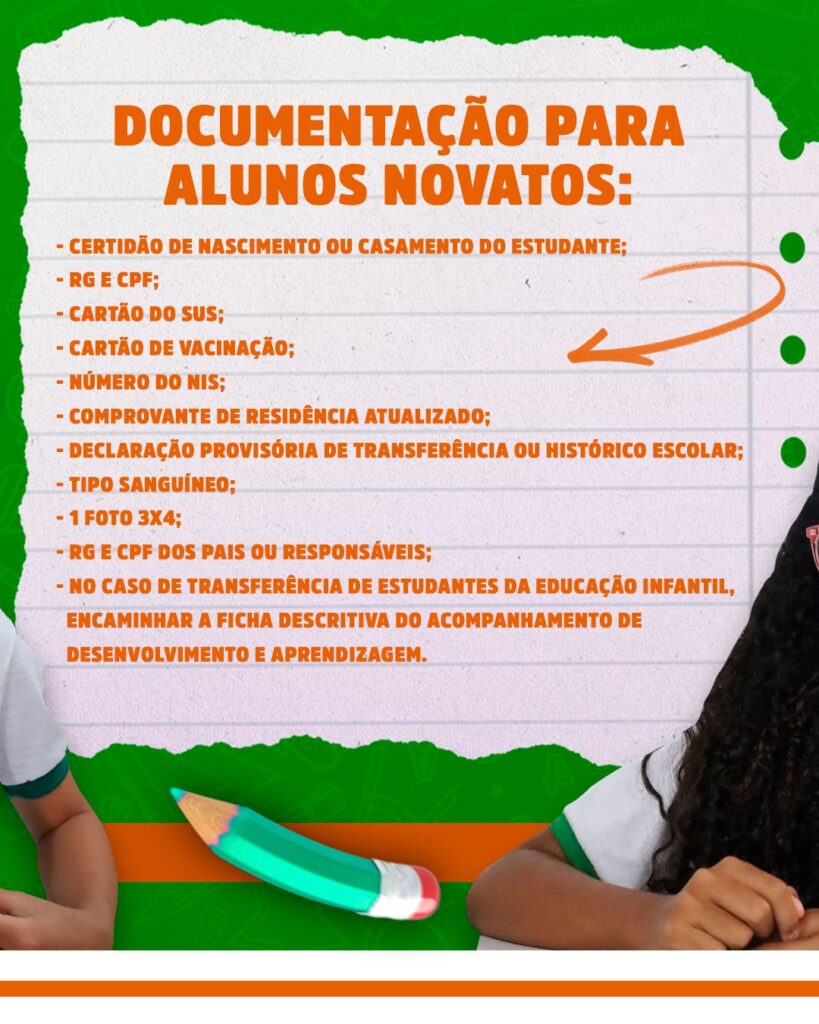 Para as matrículas de alunos novatos, é necessário apresentar a seguinte documentação: Certidão de Nascimento ou Casamento do estudante; RG e CPF; Cartão do SUS; Cartão de Vacinação; Número do NIS; Comprovante de residência atualizado; Declaração Provisória de Transferência ou Histórico Escolar; Tipo sanguíneo; 1 foto 3×4; RG e CPF dos pais ou responsáveis; e, no caso de transferência da Educação Infantil, a Ficha Descritiva do Acompanhamento de Desenvolvimento e Aprendizagem.