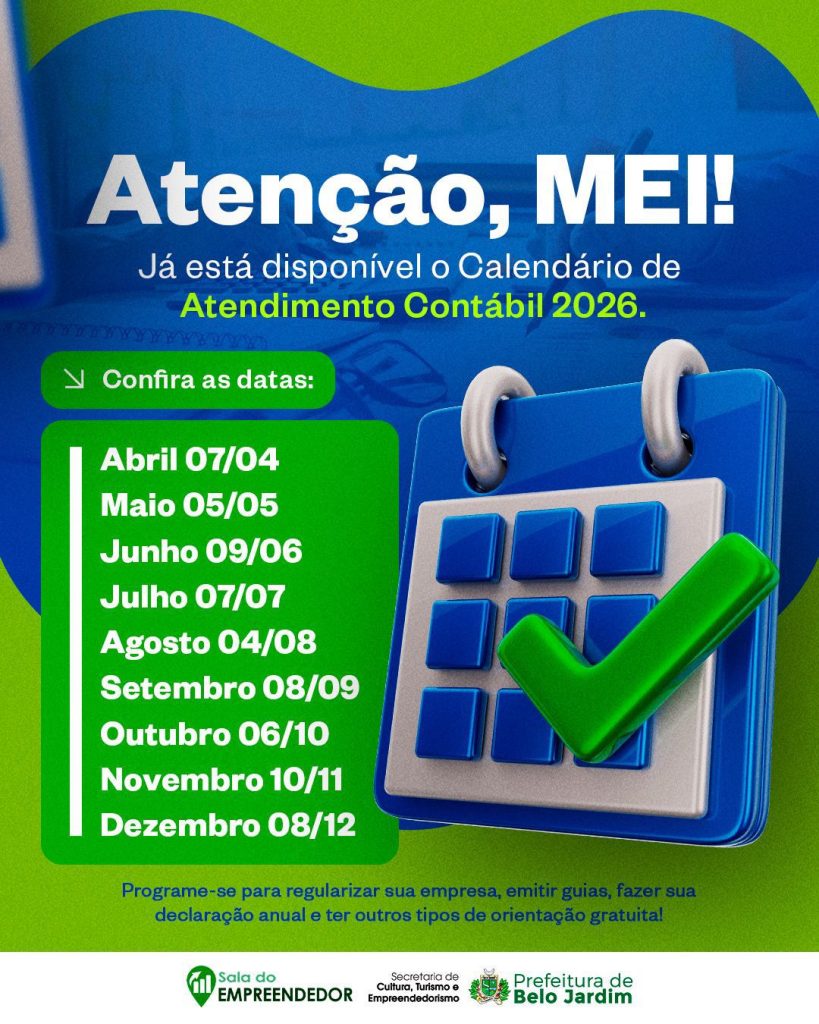A Sala do Empreendedor de Belo Jardim, divulgou o calendário de atendimento contábil gratuito para o ano de 2026. A ação é voltada aos Microempreendedores Individuais (MEIs) do município e tem o objetivo de facilitar o acesso a serviços essenciais, como regularização de pendências, emissão de guias e envio da declaração anual, garantindo mais organização e segurança para quem empreende.